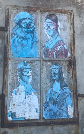 This is a photograph of a disused doorway in an old building in Venice. There is an anon. bill poster artist using the motif of the diving mask in a creative way. The work can be seen as a single poster or a collective, they choose to post on old walls or disused spaces. The bill boards are drawn/collaged cleverly onto images traced and enlarged from famous Leonardo Da Vinci paintings and drawings.
